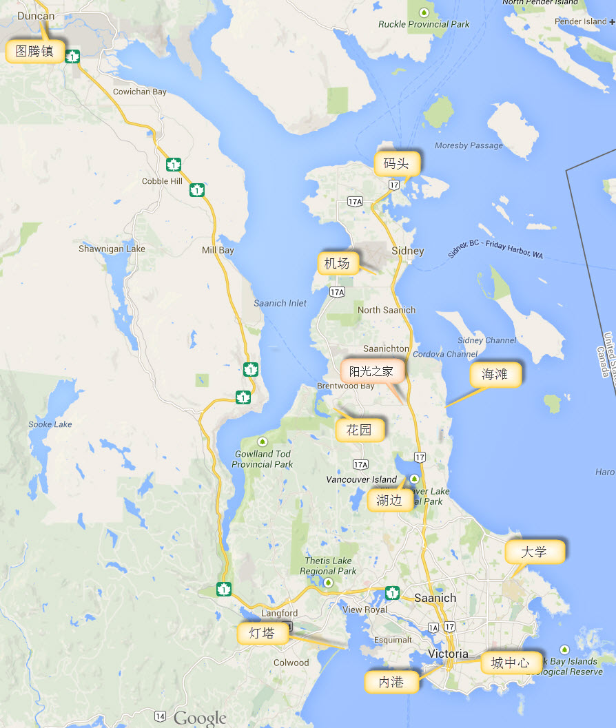 大维多利亚由几个区组成,阳光之家位于大维多利亚的中心区(Central Saanich),比邻17号高速公路和Keating Cross主干道,交通四通八达,十分便利,开车5分钟到布查/宝翠花园,10分钟到机场,15分钟到码头/或市中心,