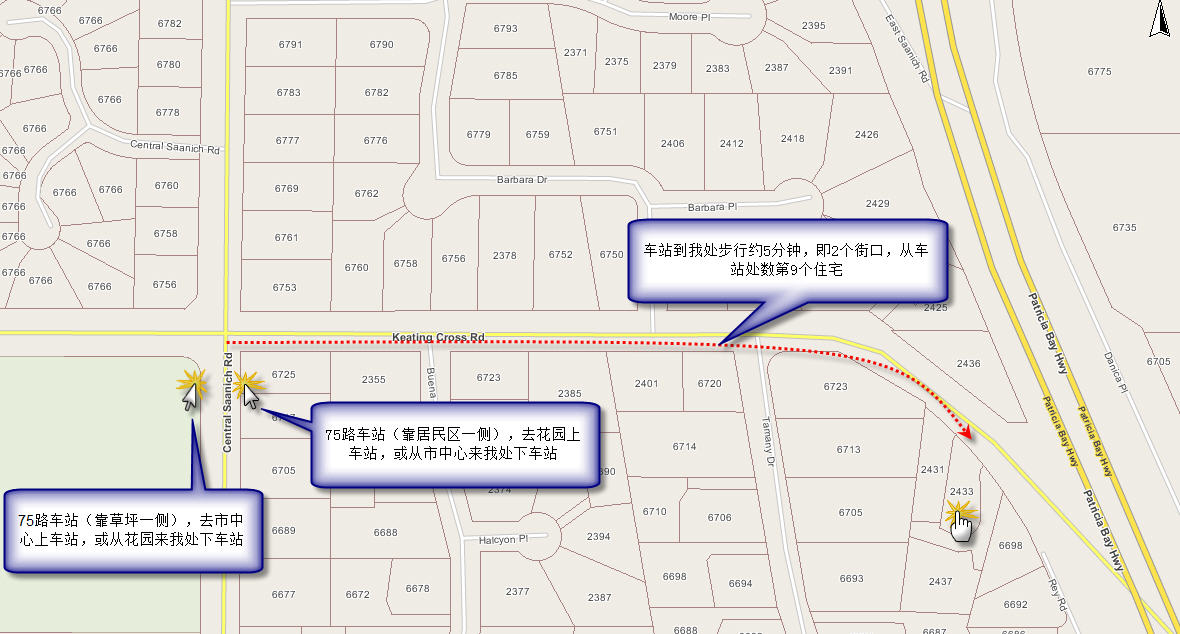 乘70路公车转75路在Central Saanich Rd.站下车即到,具体请参见码头到住处,也有很多游客从码头乘81到终点(宝翠花园),游览完花园以后乘75到我处--花园到住处,75路下车后到我处参见步行路线图。