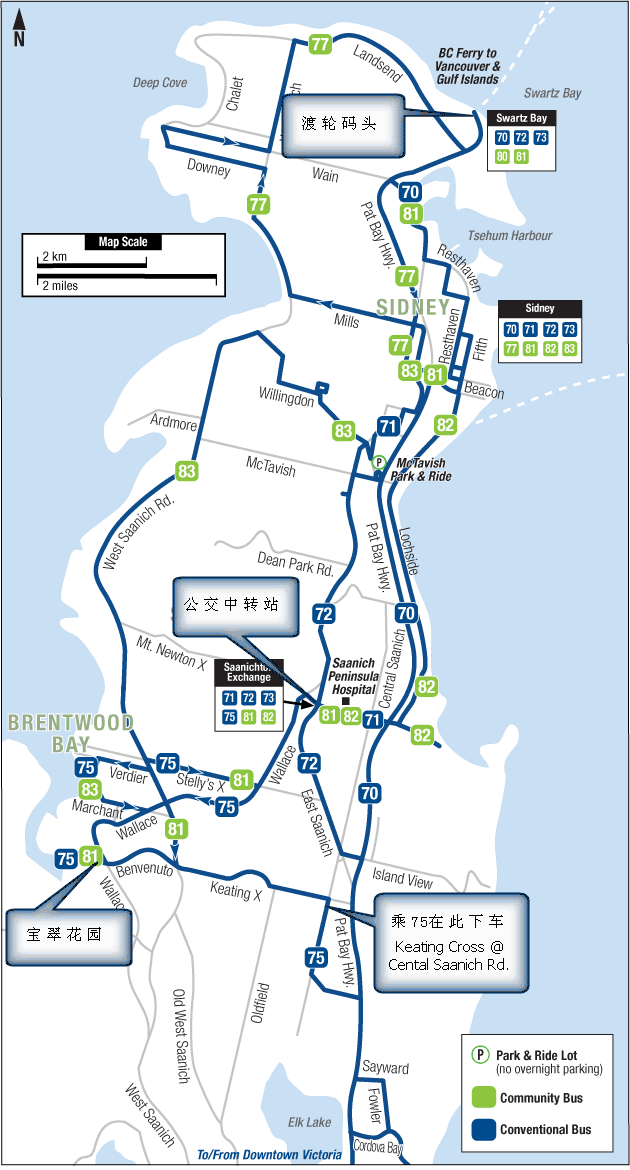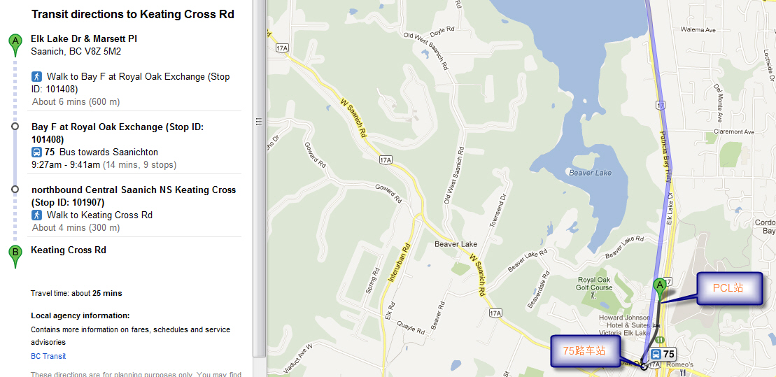 乘PCL在Elk Lake Dr at Marsett Pl. (Royal Oak)站下车,步行到临近的75路车站(如图),乘开往Saanichton方向的75路到Keating Cross Rd.站下车即到,下车位置参见步行路线图